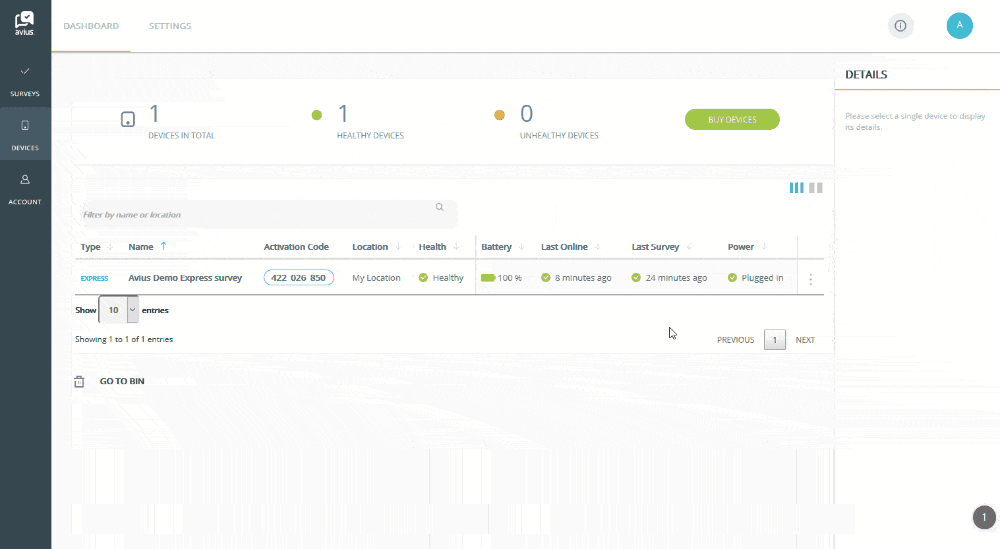 Login to Avius Surveys and click on Devices in the left-hand menu to see your list of devices.