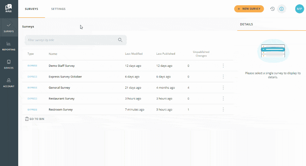 Login to Avius Surveys and click on Surveys in the left-hand menu to see your list of surveys.